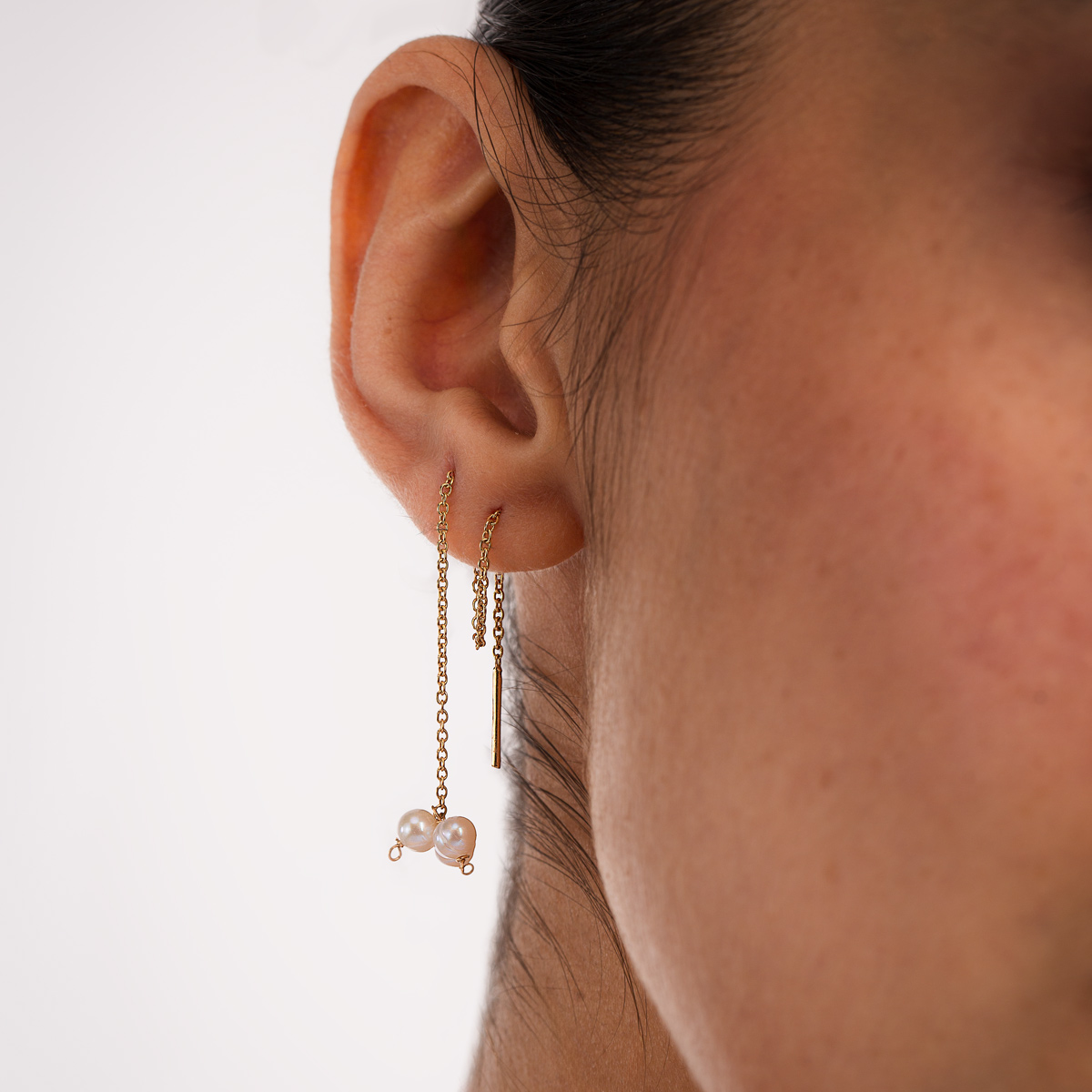 گوشواره طلا بخیه ای سه مروارید، با طراحی زیبا، استایل شما را خاص و جذاب می‌کند.