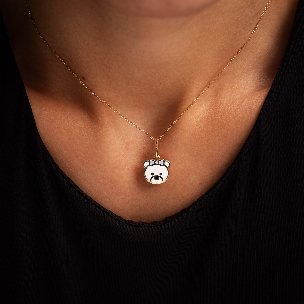 آویز طلا بچه گانه میناکاری Teddy Bow، ساخته شده از طلای ۱۸ عیار و کاملاً دست ساز می باشد.