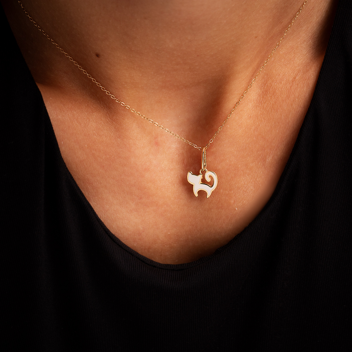 آویز طلا بچه گانه میناکاری لوسی کَت، ساخته شده از طلای ۱۸ عیار و کاملاً دست ساز می باشد.
